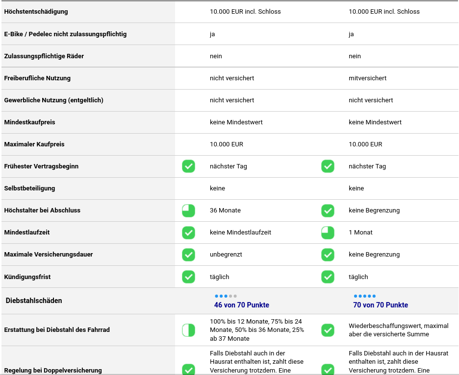 Nicht jede E-Bike-Versicherung bietet die beste Leistung für das gleiche Geld. Daher haben wir einen übersichtlichen Leistungsvergleich entworfen, in dem Sie anhand von einfachen Grafiken und Texten direkt vergleichen können, welche E-Bike-Versicherung für Sie am besten geeignet ist.